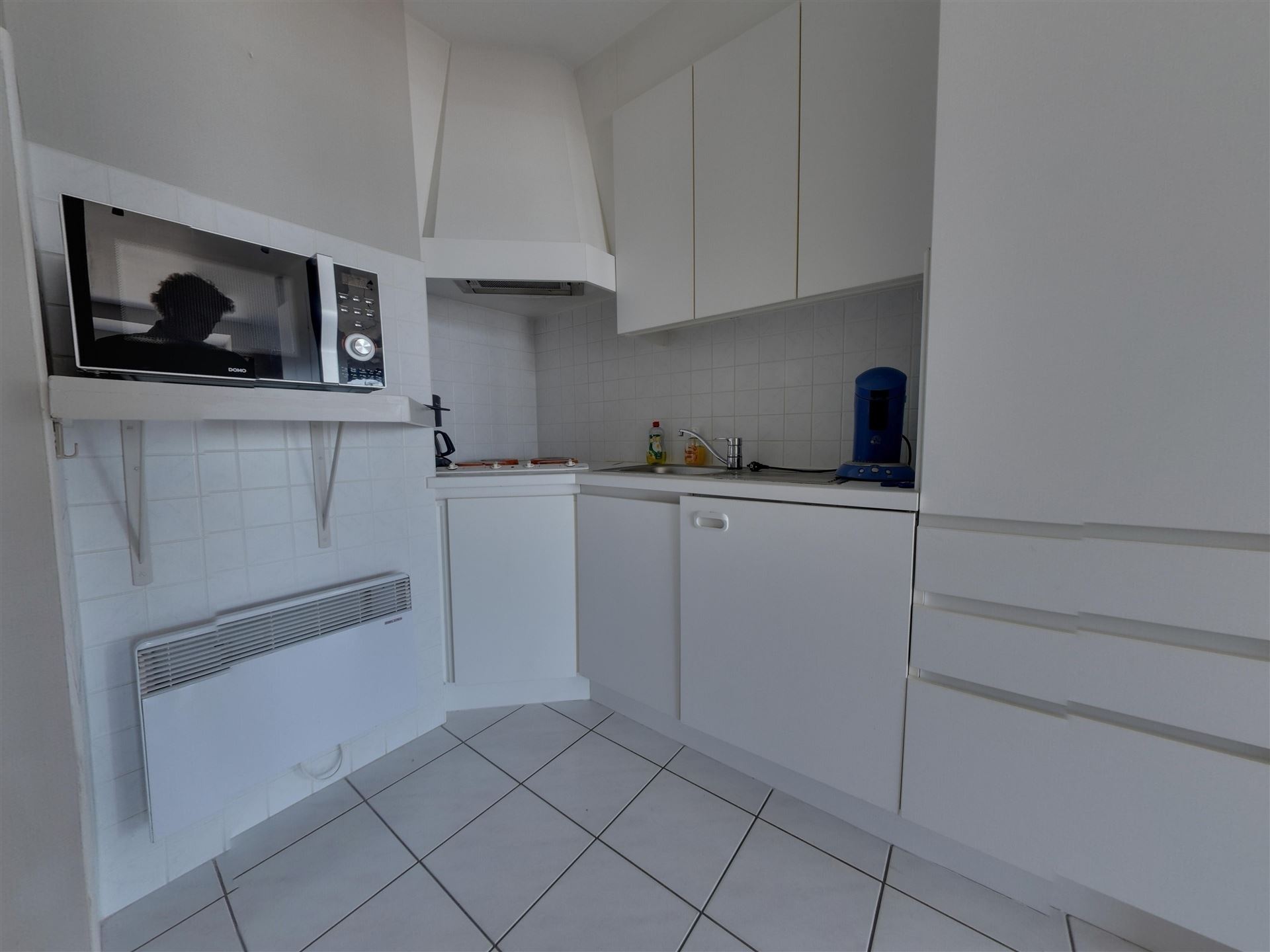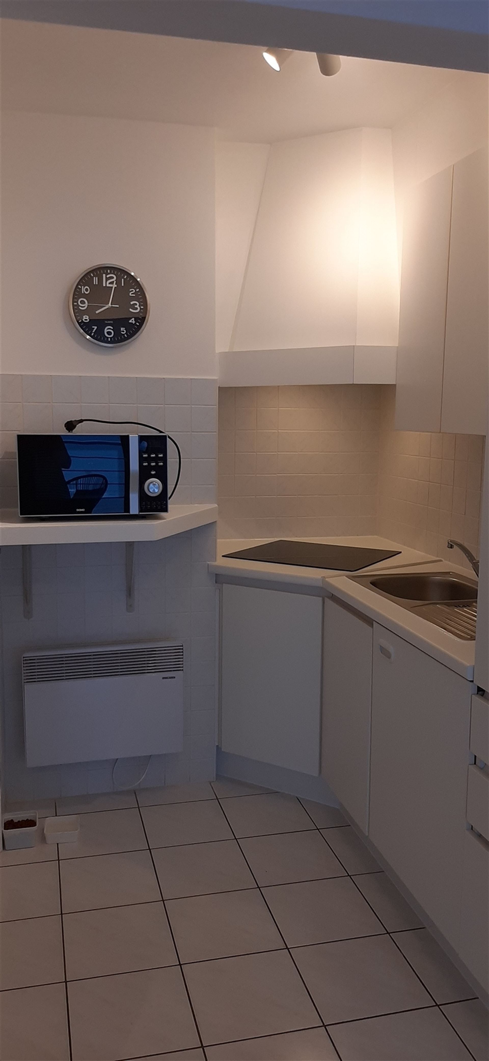 aménagement : salle de bain, cuisine ouverte, espace de vie avec meuble de chevet, terrasse debout avec vue sur la mer. Prix de location 600 euro et 30 euro frais de syndic. Disponible à partir du 1/9.