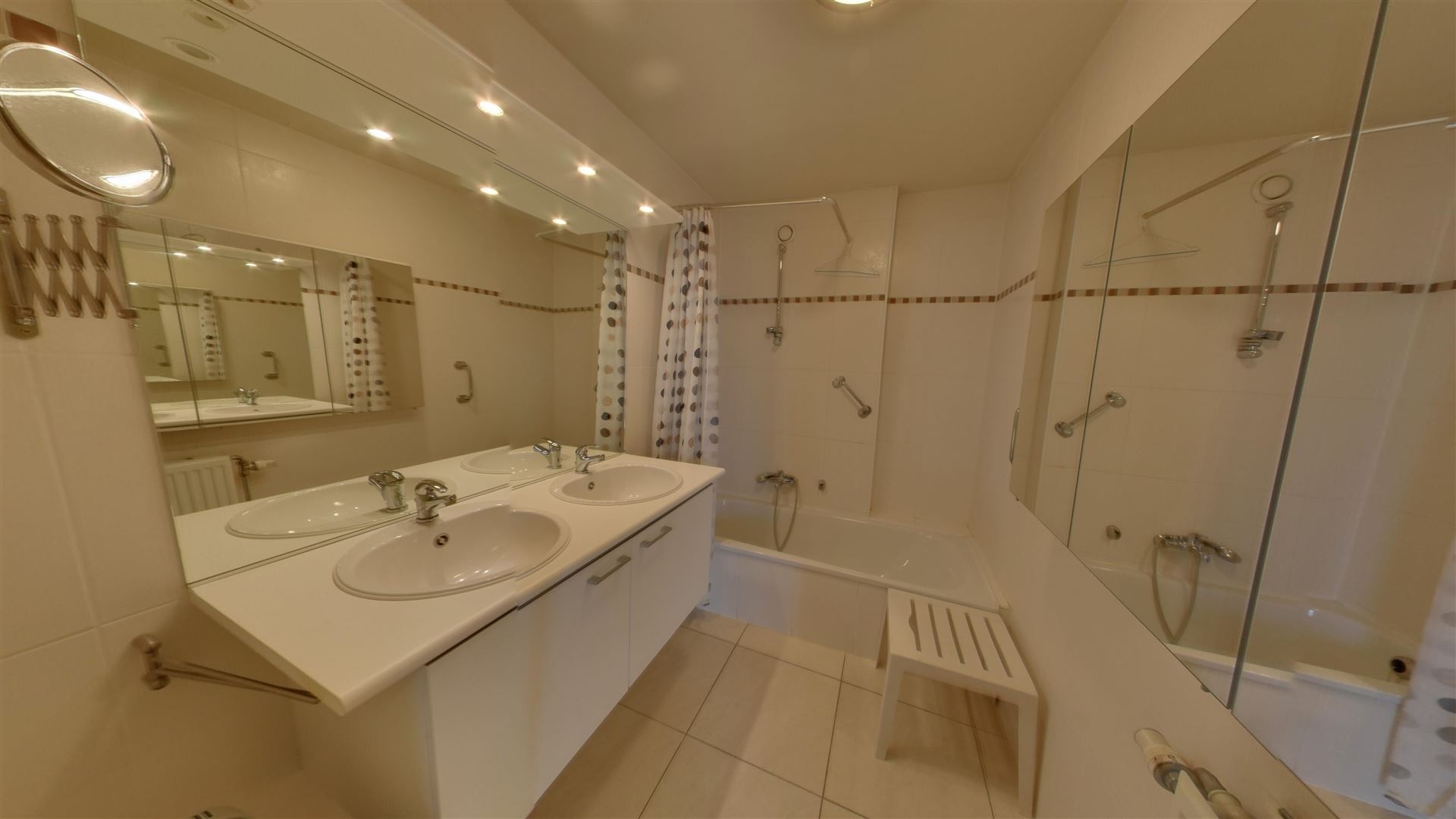 De stijlvolle badkamer is voorzien van een dubbele wastafel en een moderne douche/badcombinatie, ontworpen voor ultiem comfort en gebruiksgemak.