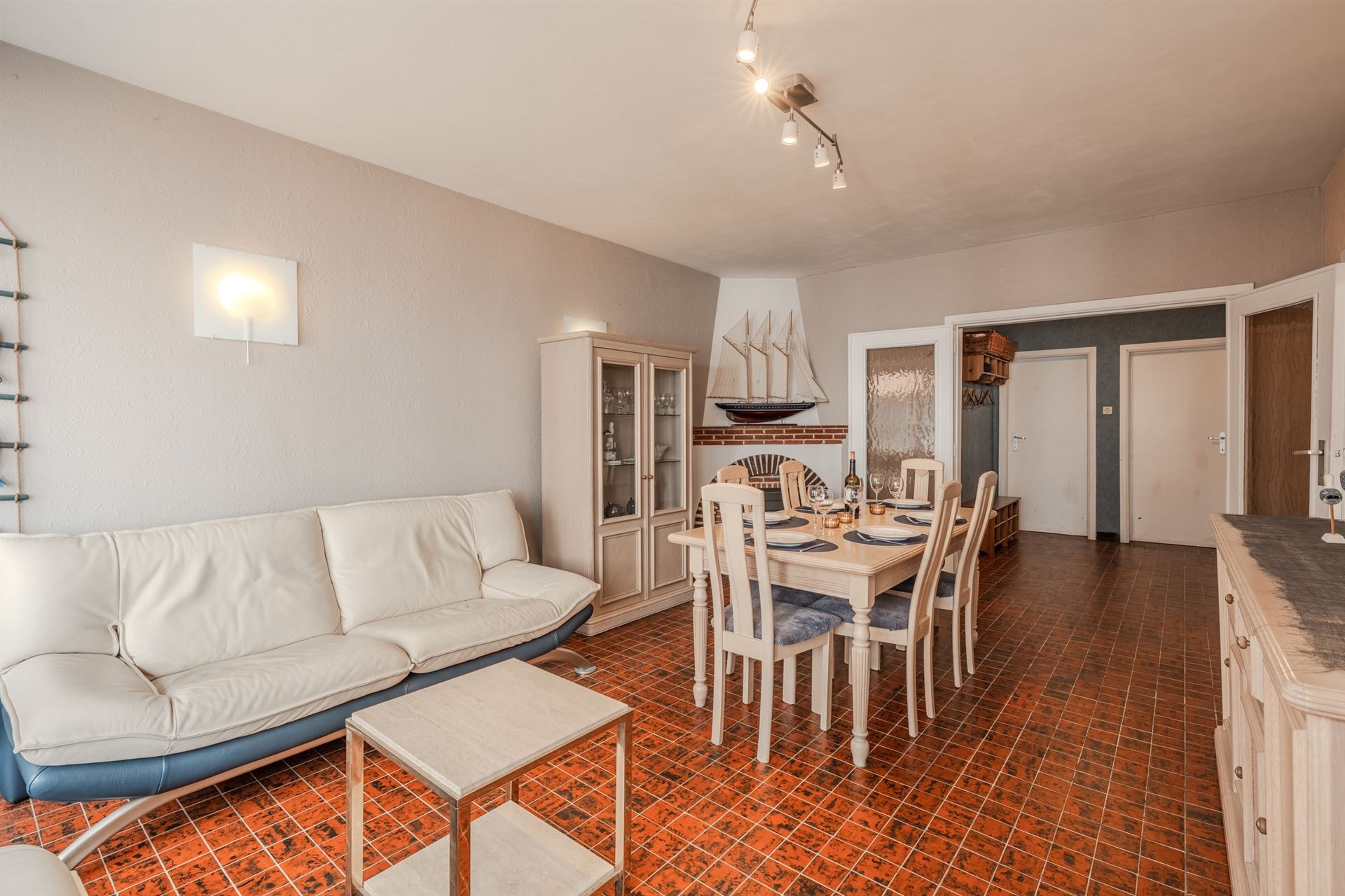 De woonkamer is licht en uitnodigend, uitgerust met een gezellige zithoek en een ruime eetruimte, perfect voor familiemomenten en gasten. De aanwezigheid van een smaakvolle open haard voegt extra warmte en gezelligheid toe.