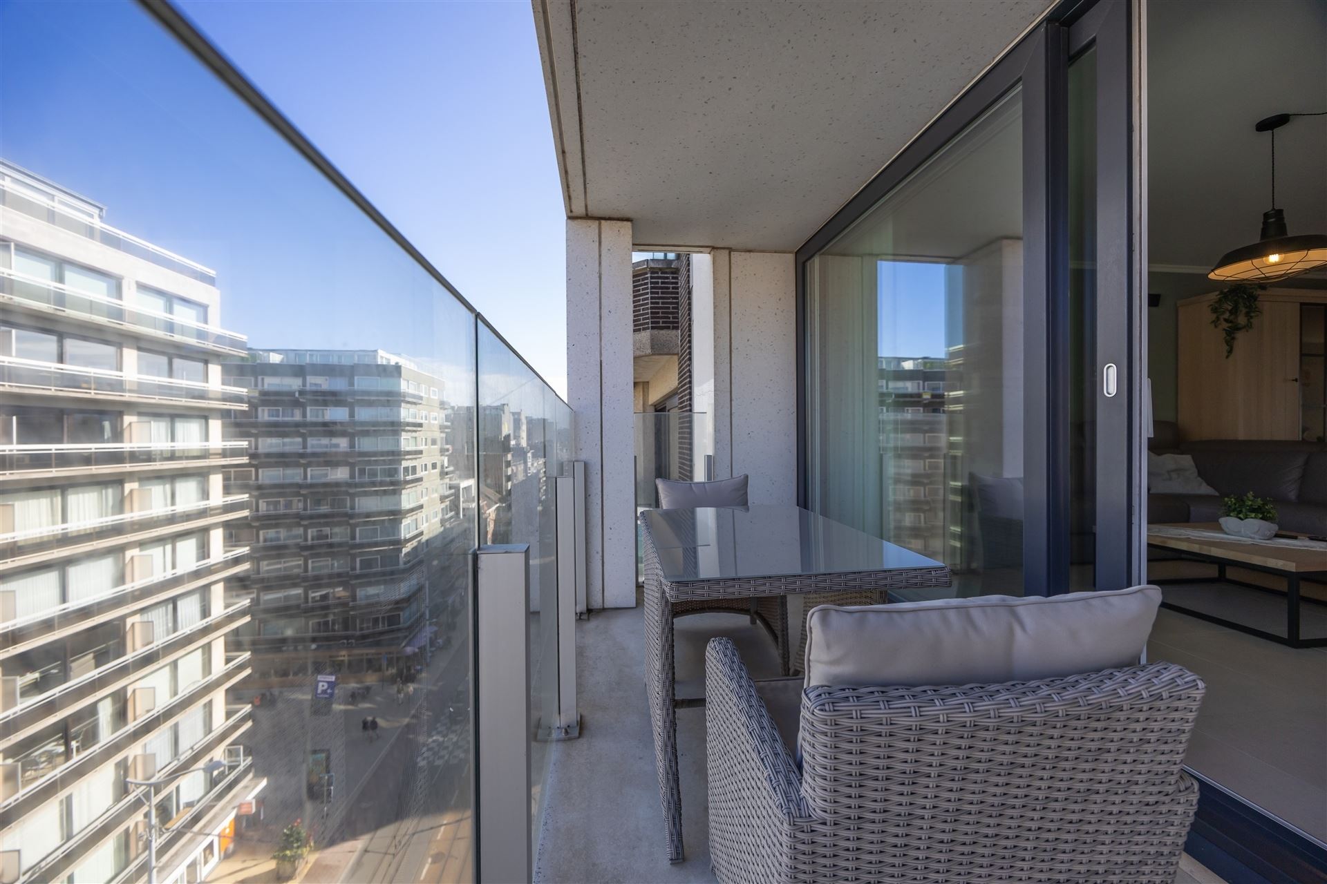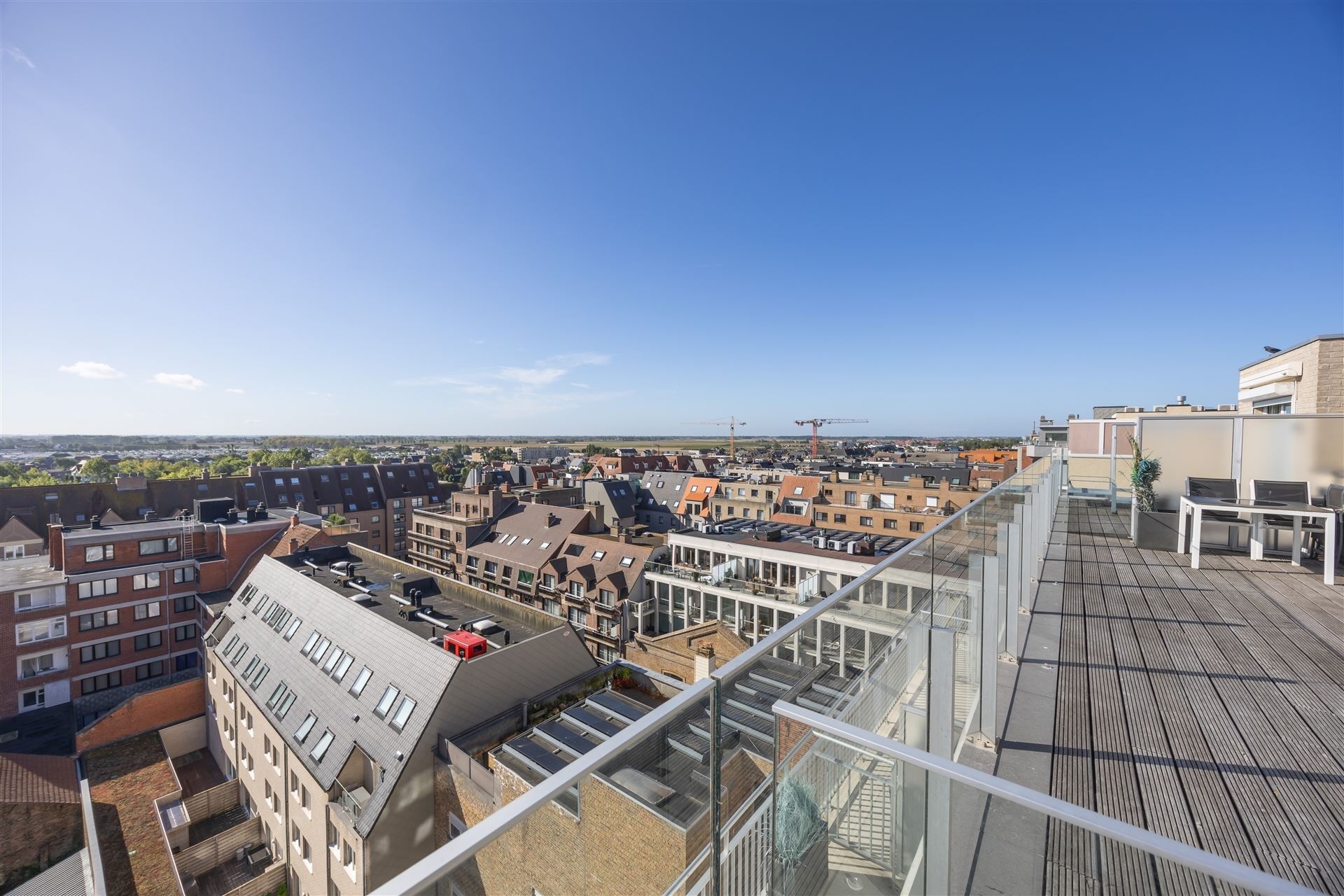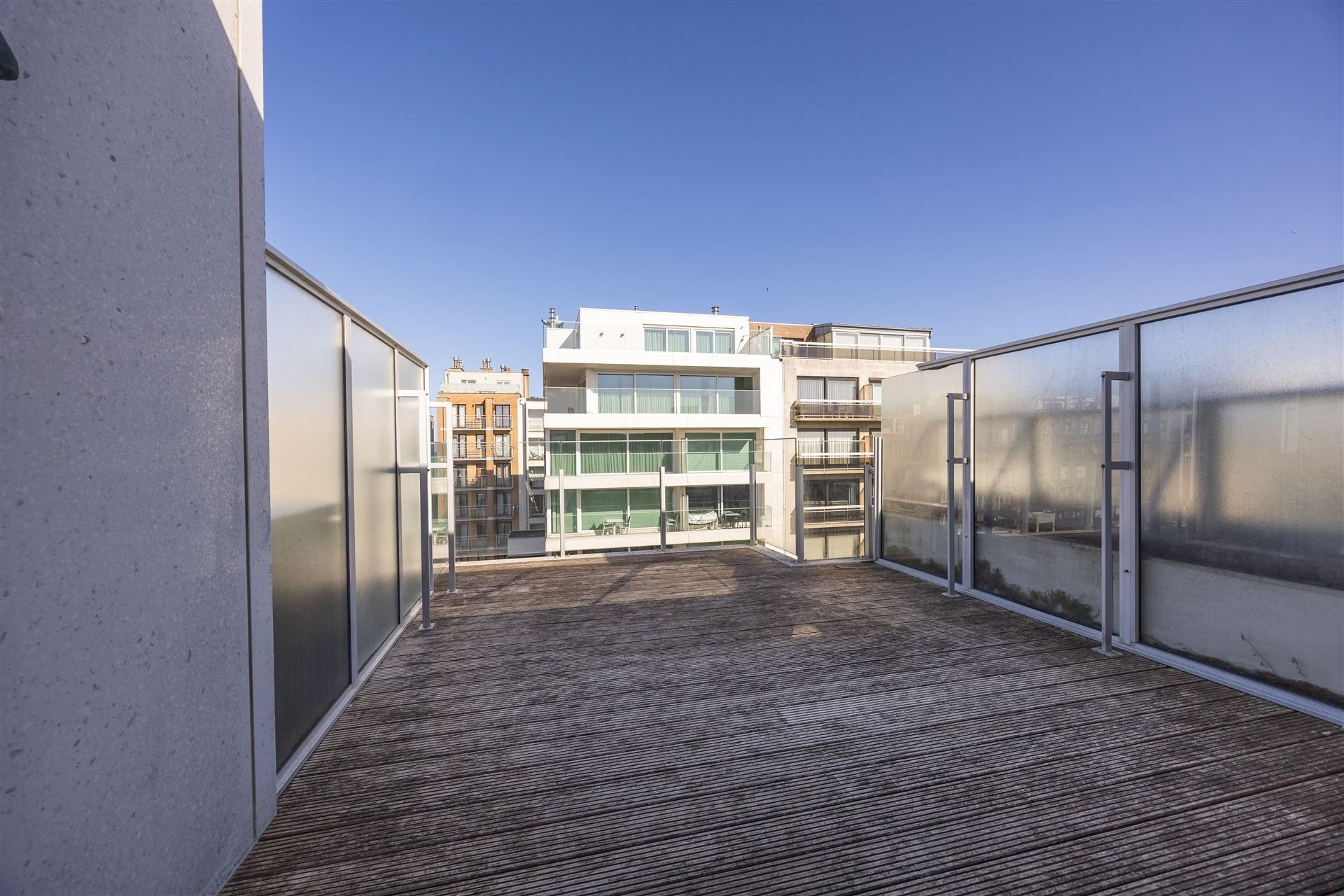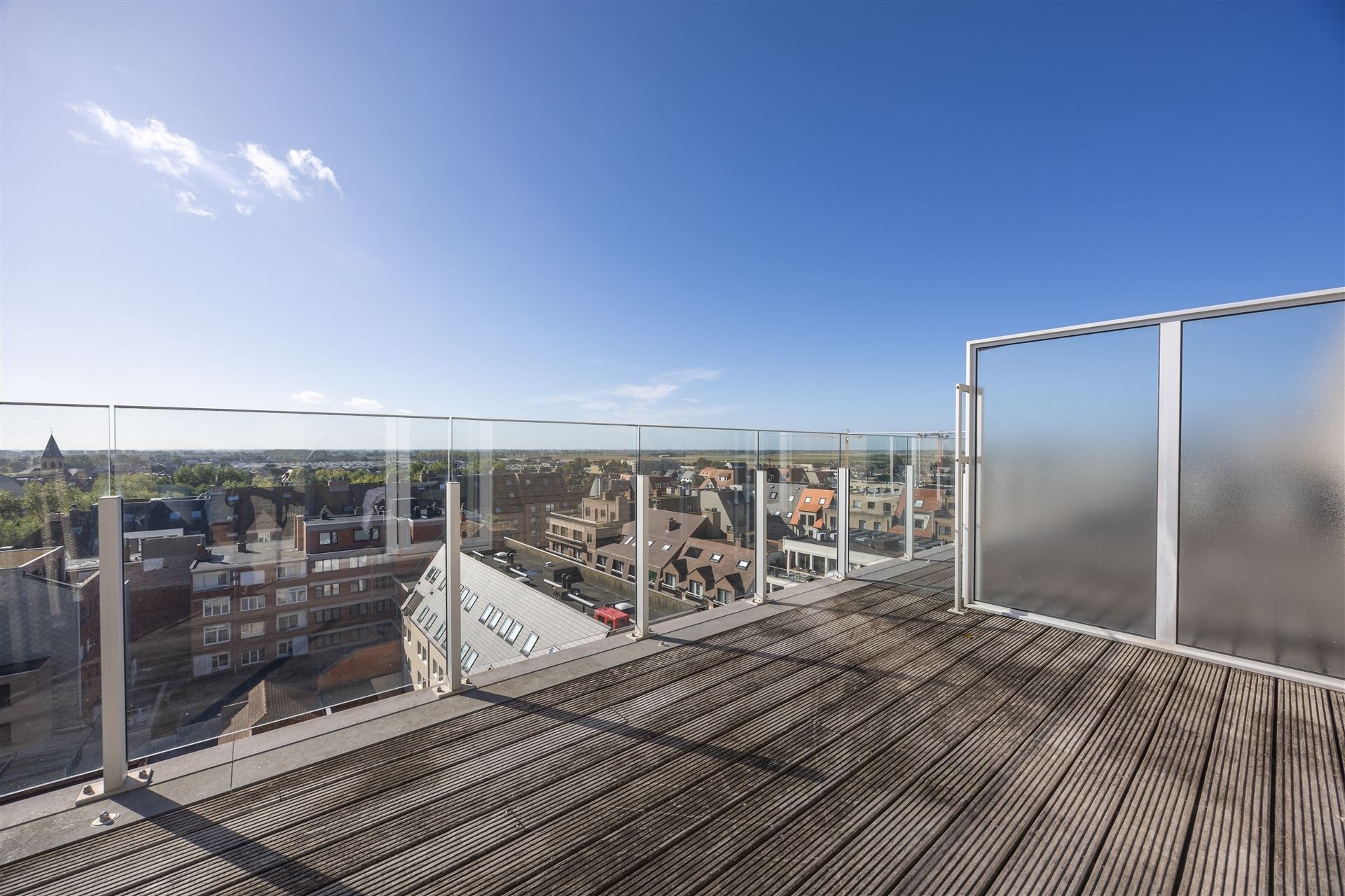 Prachtig duplex dakappartement gelegen op de 7e en 8e verdieping in recent gebouw ( bouwjaar 2015) midden in het winkelcentrum, vlakbij de Zeedijk, het nieuwe casino, gemeentelijk park. Ruim pand met een bewoonbare oppervlakte van 106m² + 46m² terras. Indeling : zeer ruime woonkamer met open volledig geïnstalleerde keuken, apart toilet, 2 slaapkamers, badkamer met dubbel lavabomeubel, ligbad met douchefunctie en 2e toilet. 4 terrassen waarvan 2 grenzend aan de woonkamer en keuken en dan nog 2 extra ruime dakterrassen grenzend aan beide slaapkamers. Inclusief private gelijkvloerse berging en gemeenschappelijke fietsenberging. Het appartement wordt volledig gemeubeld verkocht. Conforme elektrische installatie. Gunstig epc label A. Appartement met zeer veel lichtinval en mooi uitzicht op de Leopoldlaan en open zicht langs achterzijde op hinterland.