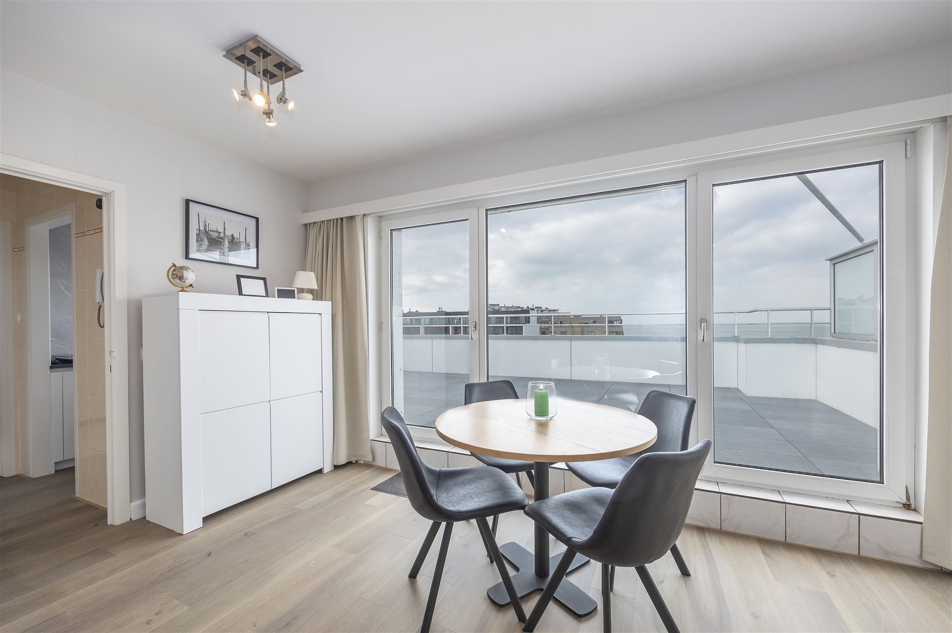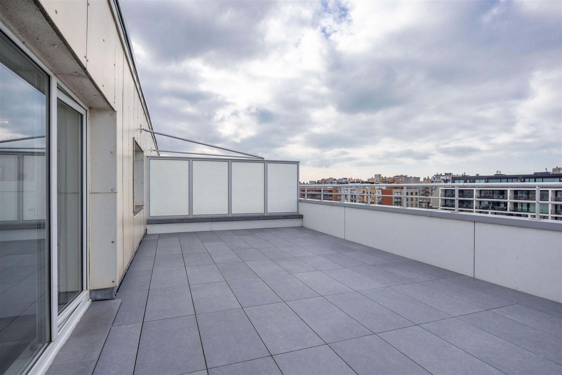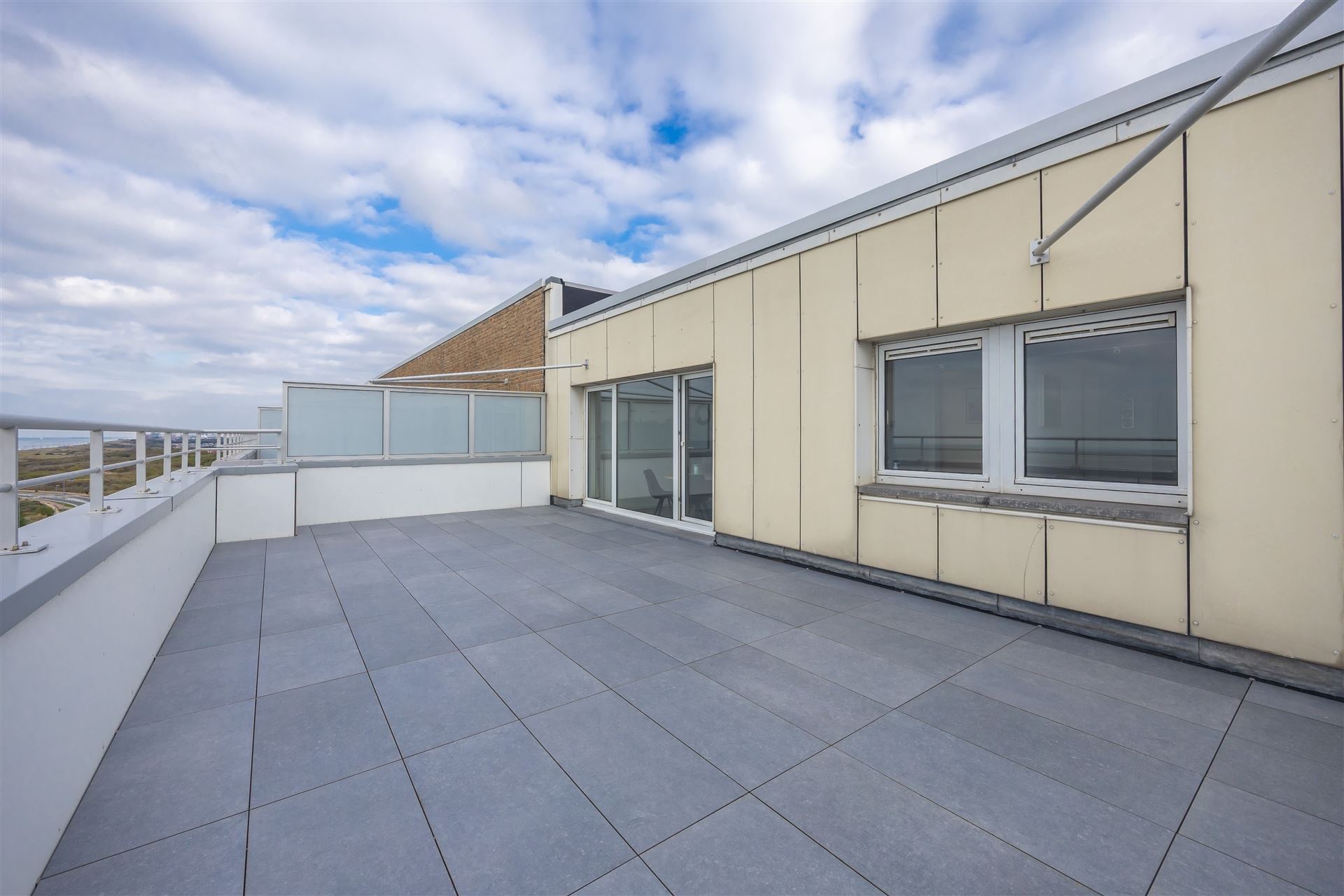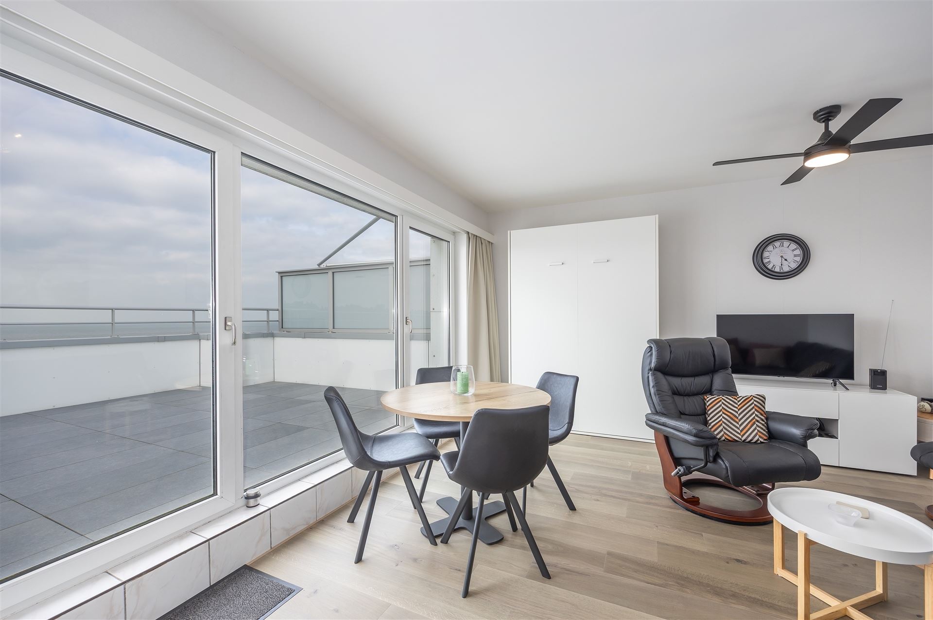 Gezellige dakstudio met groot zonneterras en mooi zeezicht. Deze studio is op de bovenste verdieping gelegen en heeft een ruime inkomhall ( waar je ook een stapelbed kan zetten); de living geeft uit op het groot dakterras. Er is een hoekzetel en een bedkast voorzien, de keuken is apart.