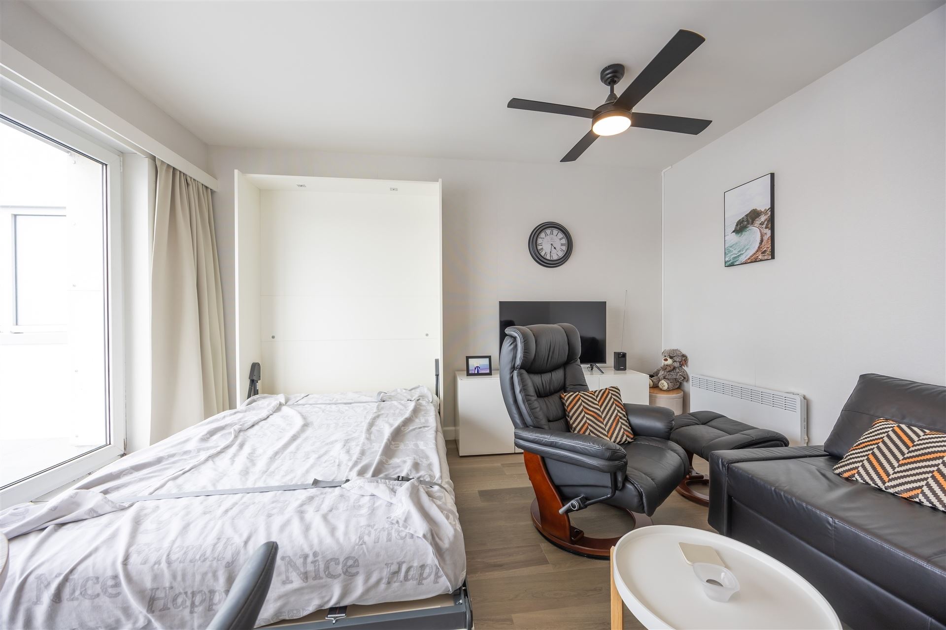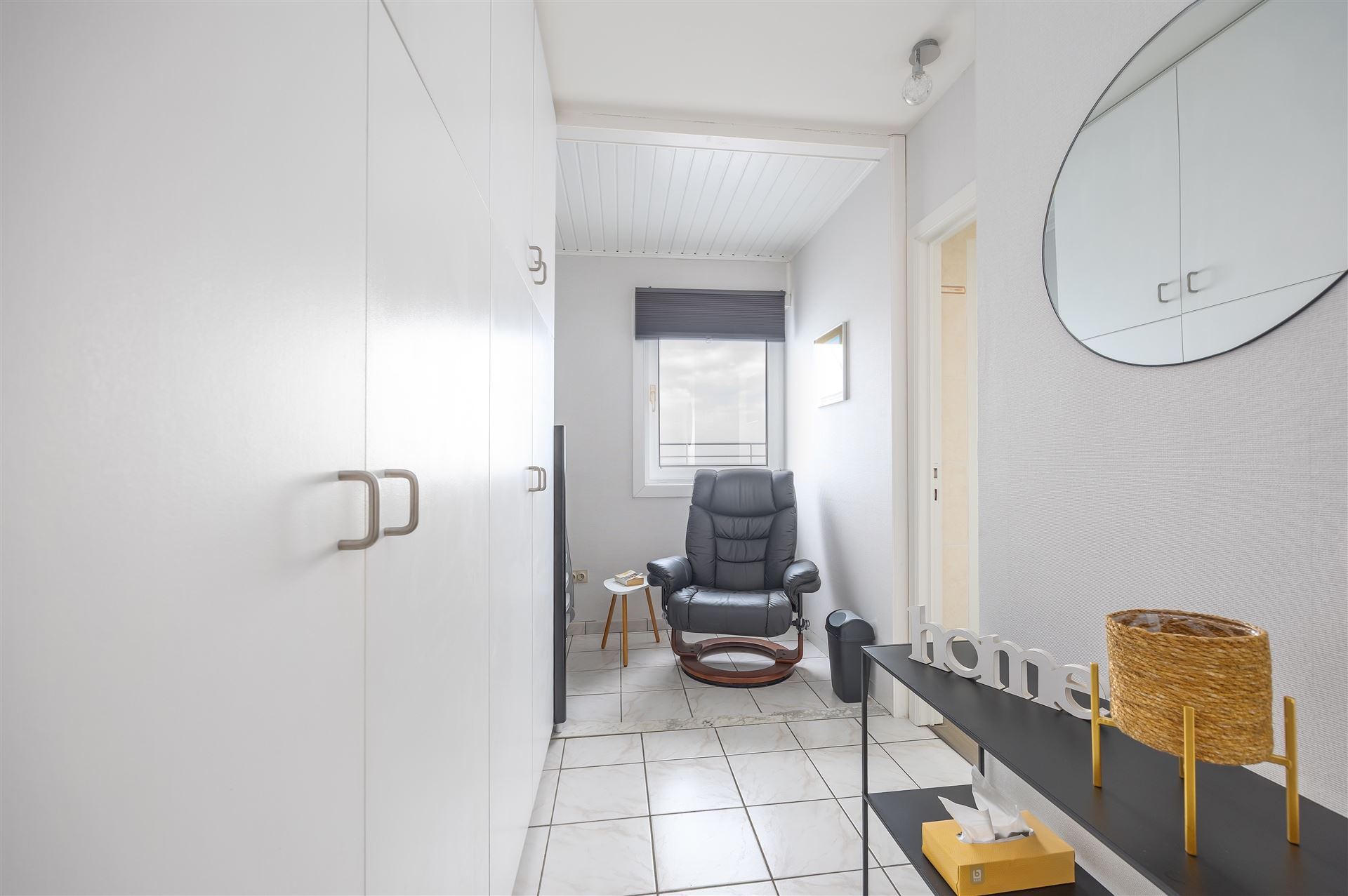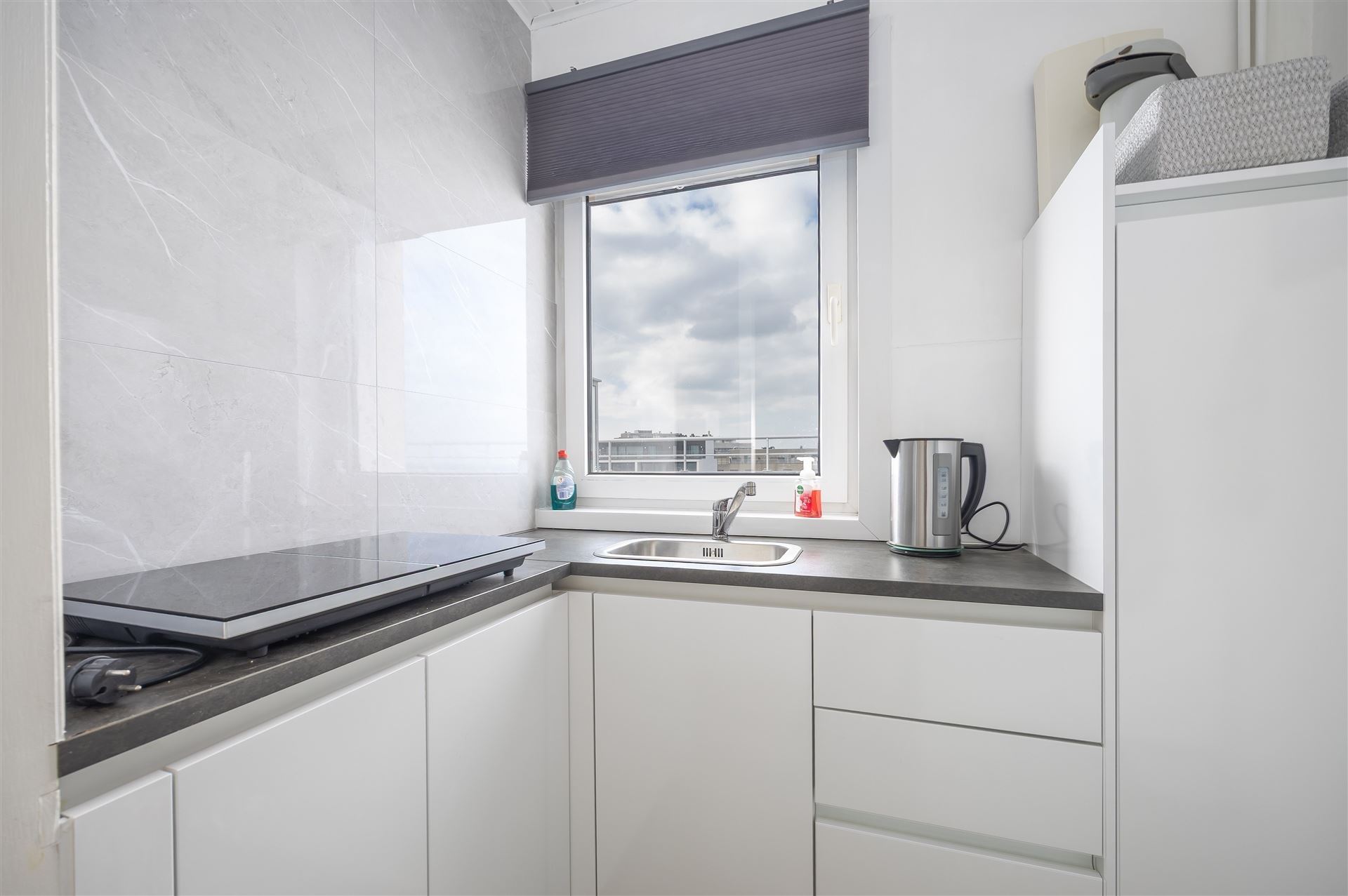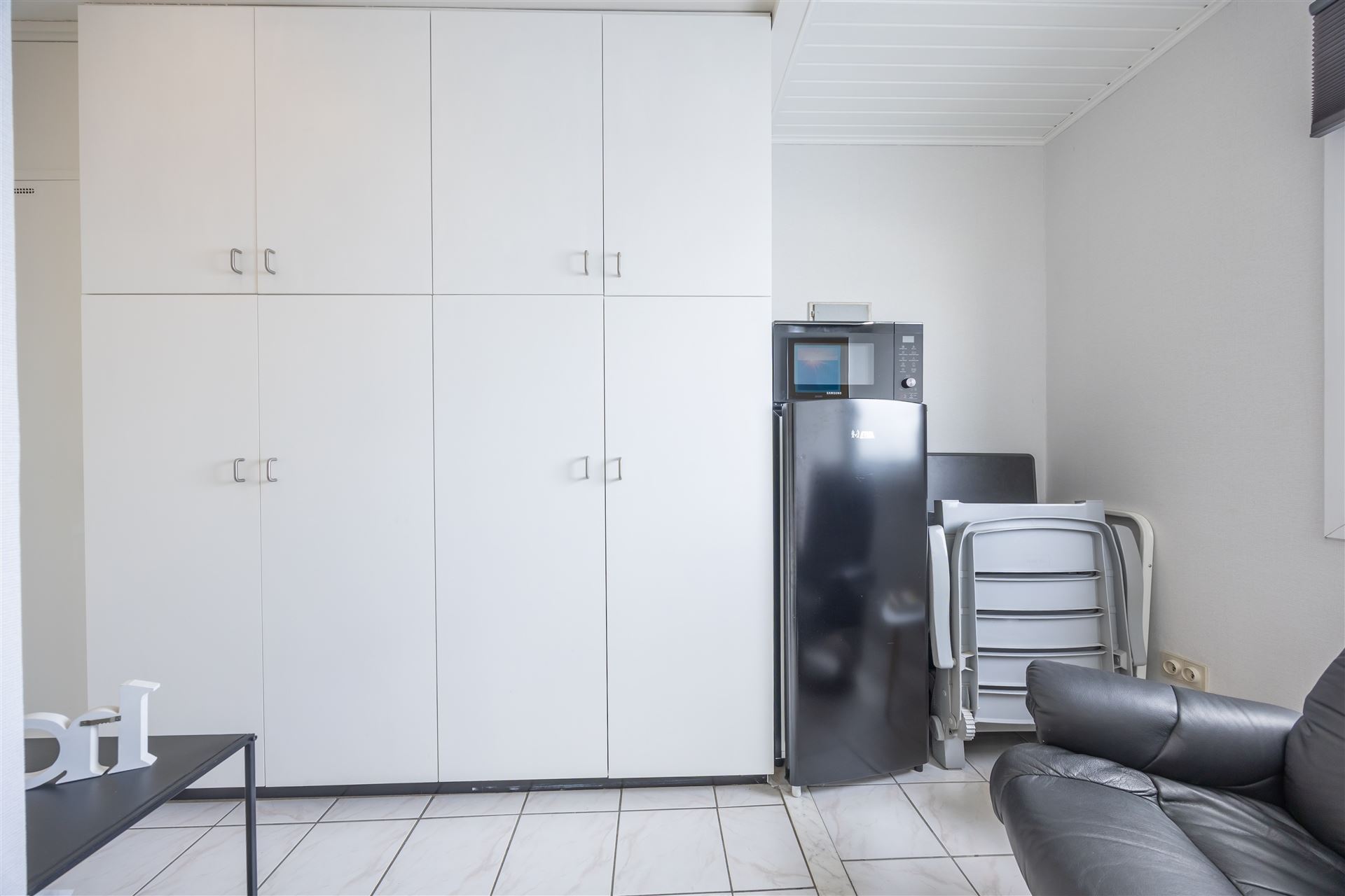 Gezellige dakstudio met groot zonneterras en mooi zeezicht. Deze studio is op de bovenste verdieping gelegen en heeft een ruime inkomhall ( waar je ook een stapelbed kan zetten); de living geeft uit op het groot dakterras. Er is een hoekzetel en een bedkast voorzien, de keuken is apart.