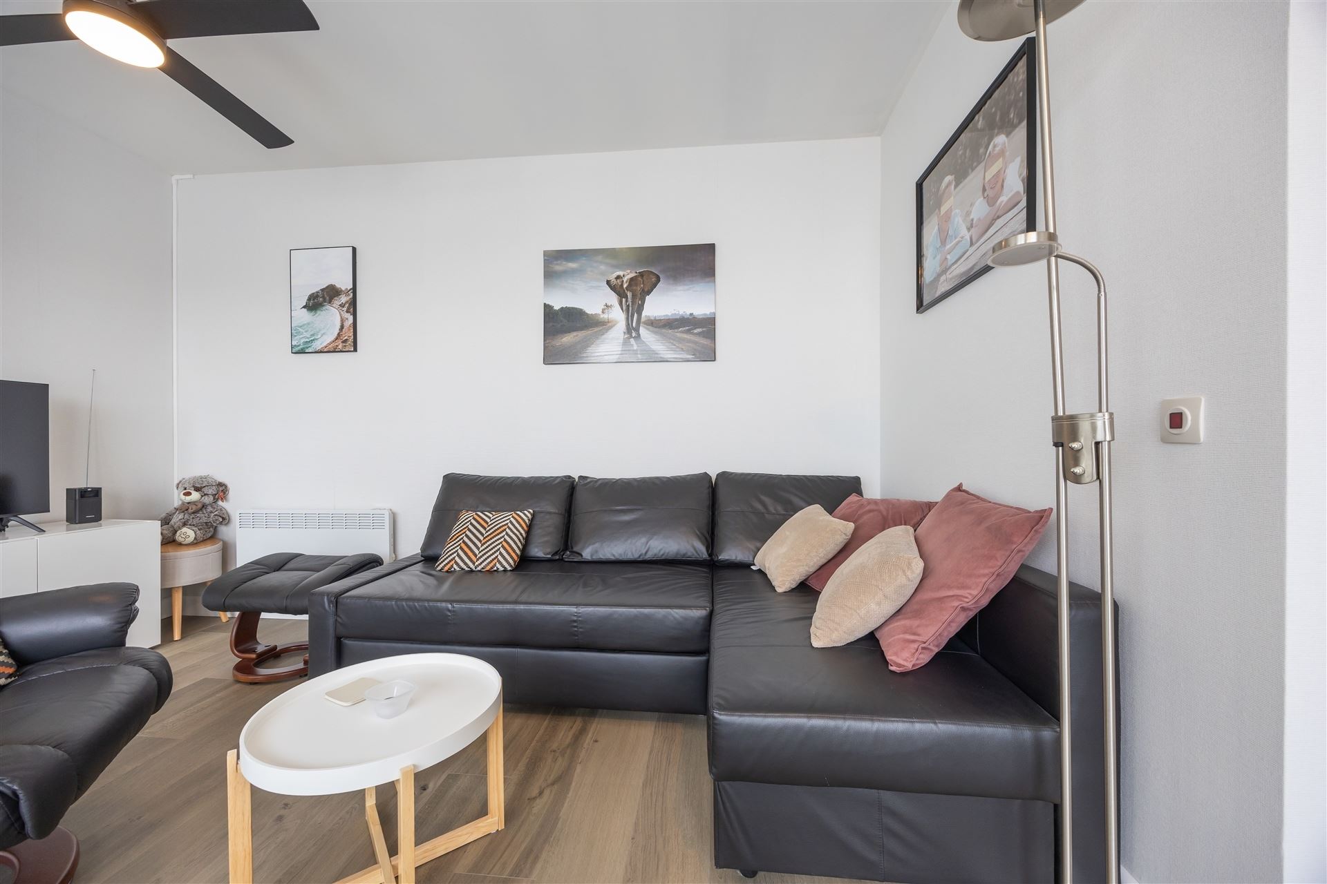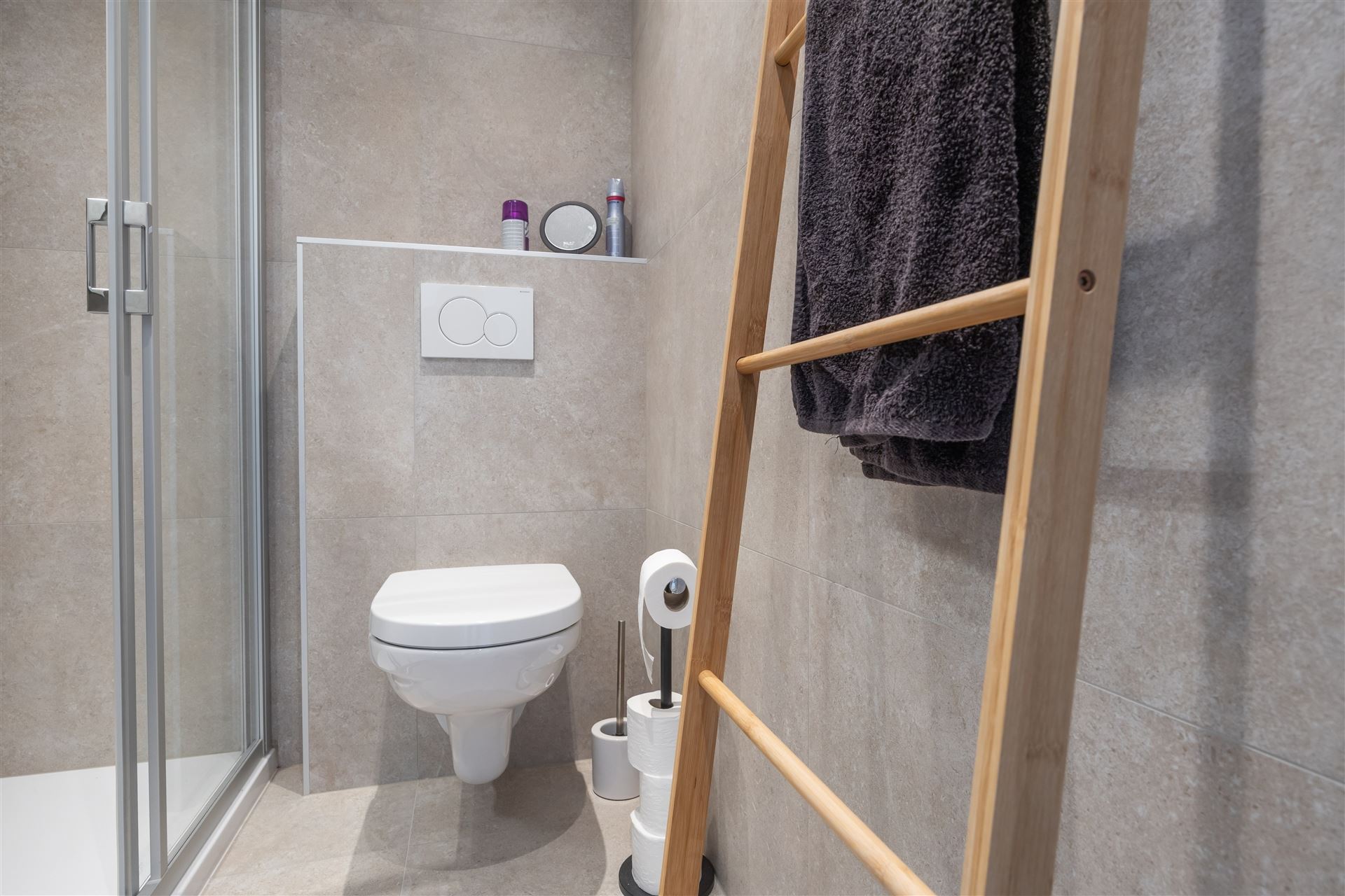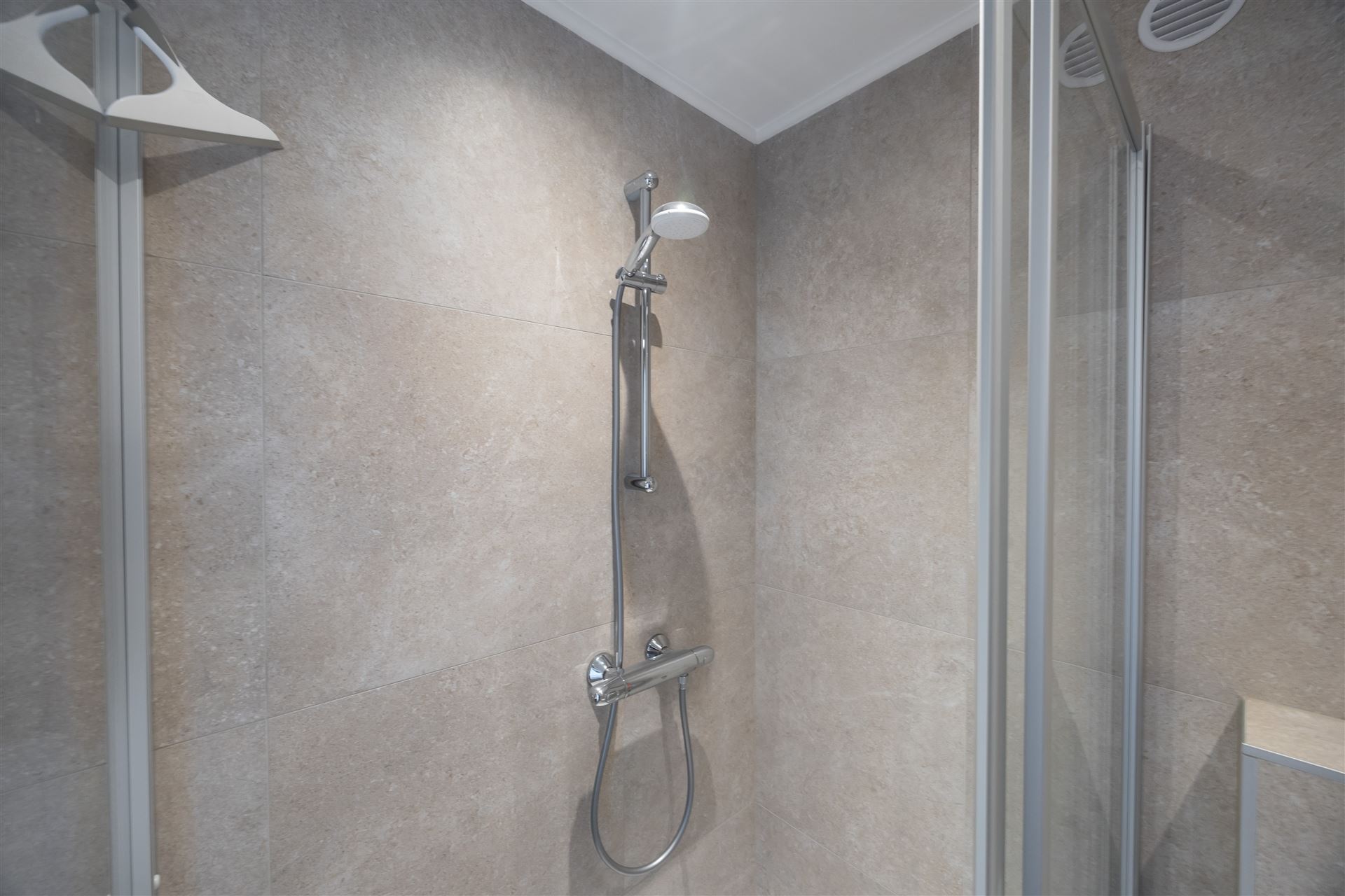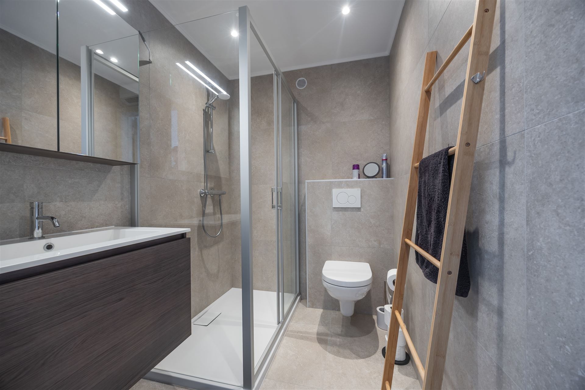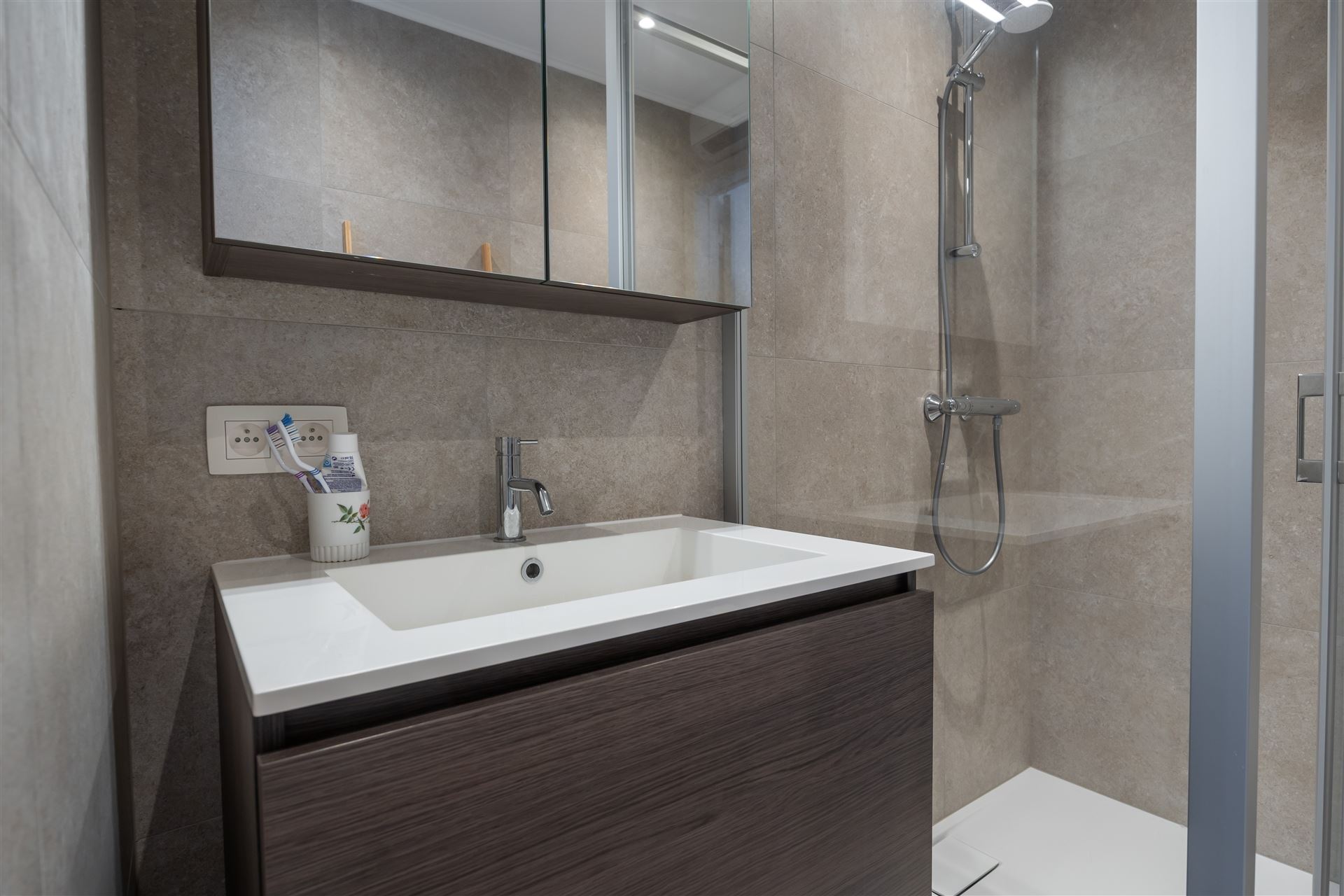 de badkamer werd volledig vernieuwd en heeft een mooie inloopdouche, wc en 1 lavabo. In deze residentie werd het dak reeds geIsoleerd en de liften vernieuwd. De achtergevel wordt binnenkort gerenoveerd.