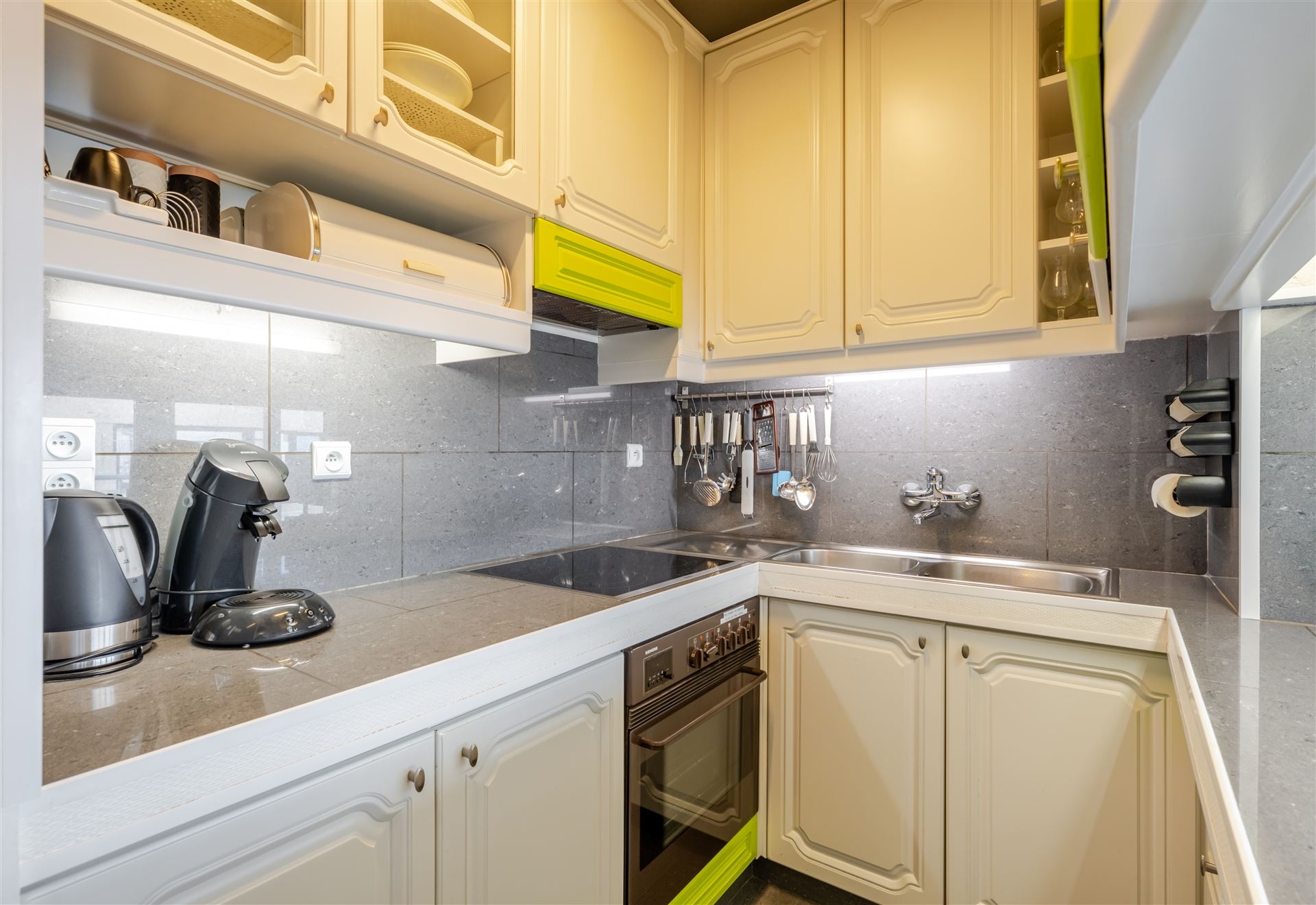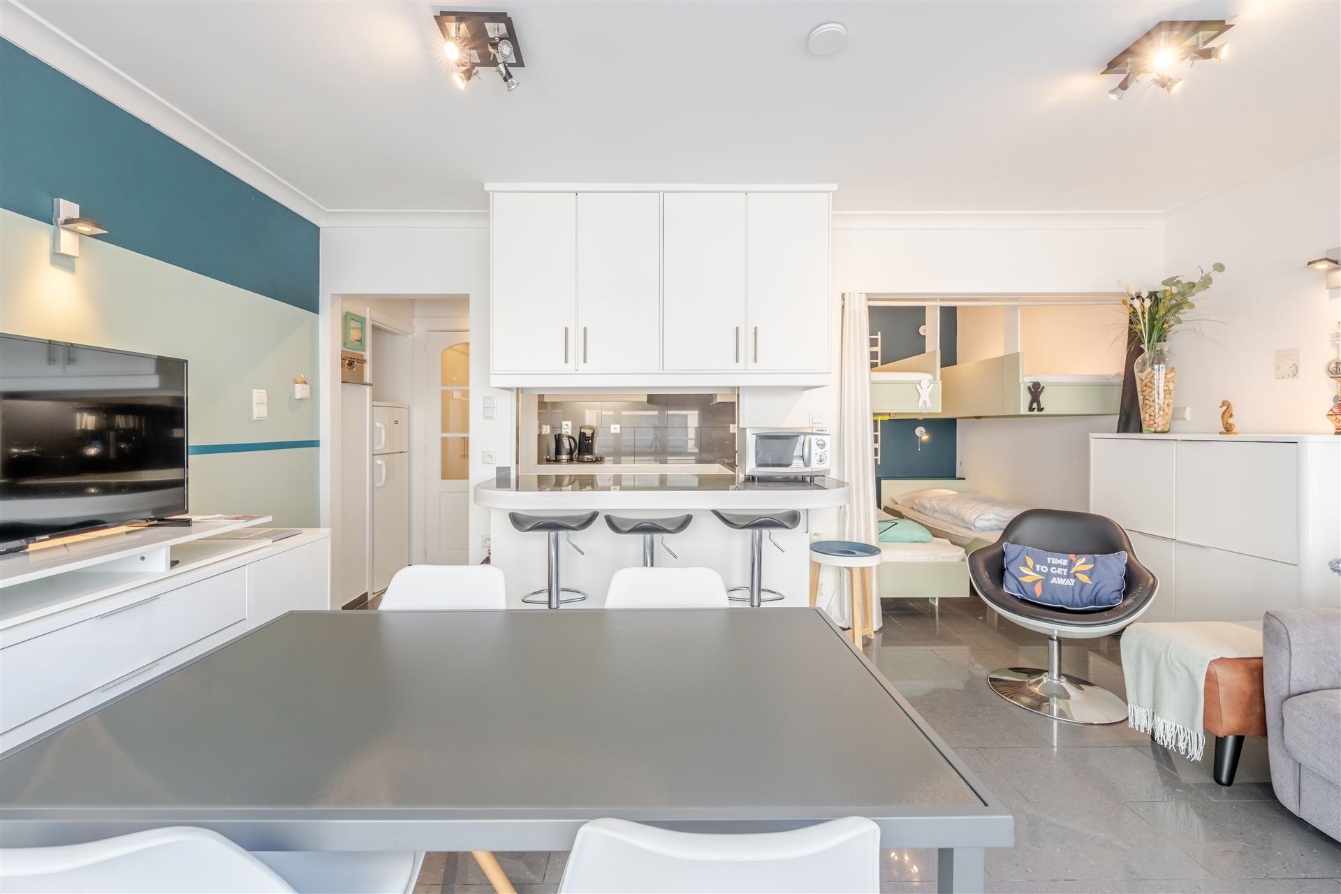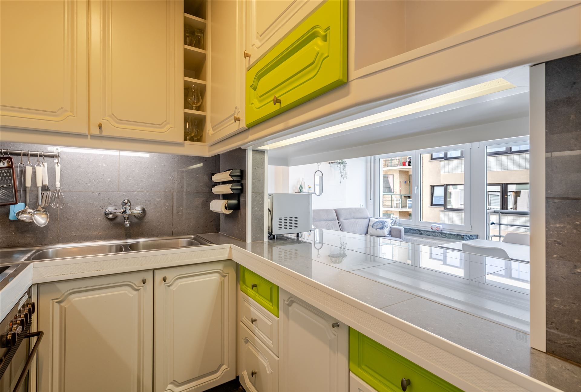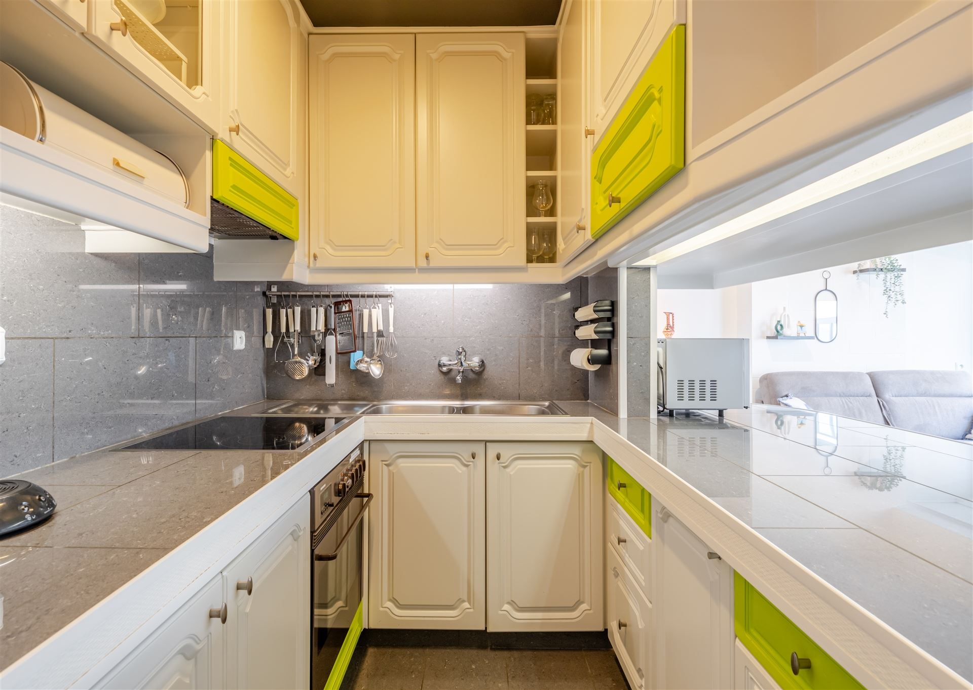 De moderne open keuken is voorzien van kwalitatieve apparatuur en werkbladen met veel opslagruimte. De slaapkamer is intelligent ingedeeld met ingebouwde kasten voor optimale ruimtebenutting. Het appartement heeft een eigentijds designconcept met frisse kleuraccentuaties en geelgroene tinten.