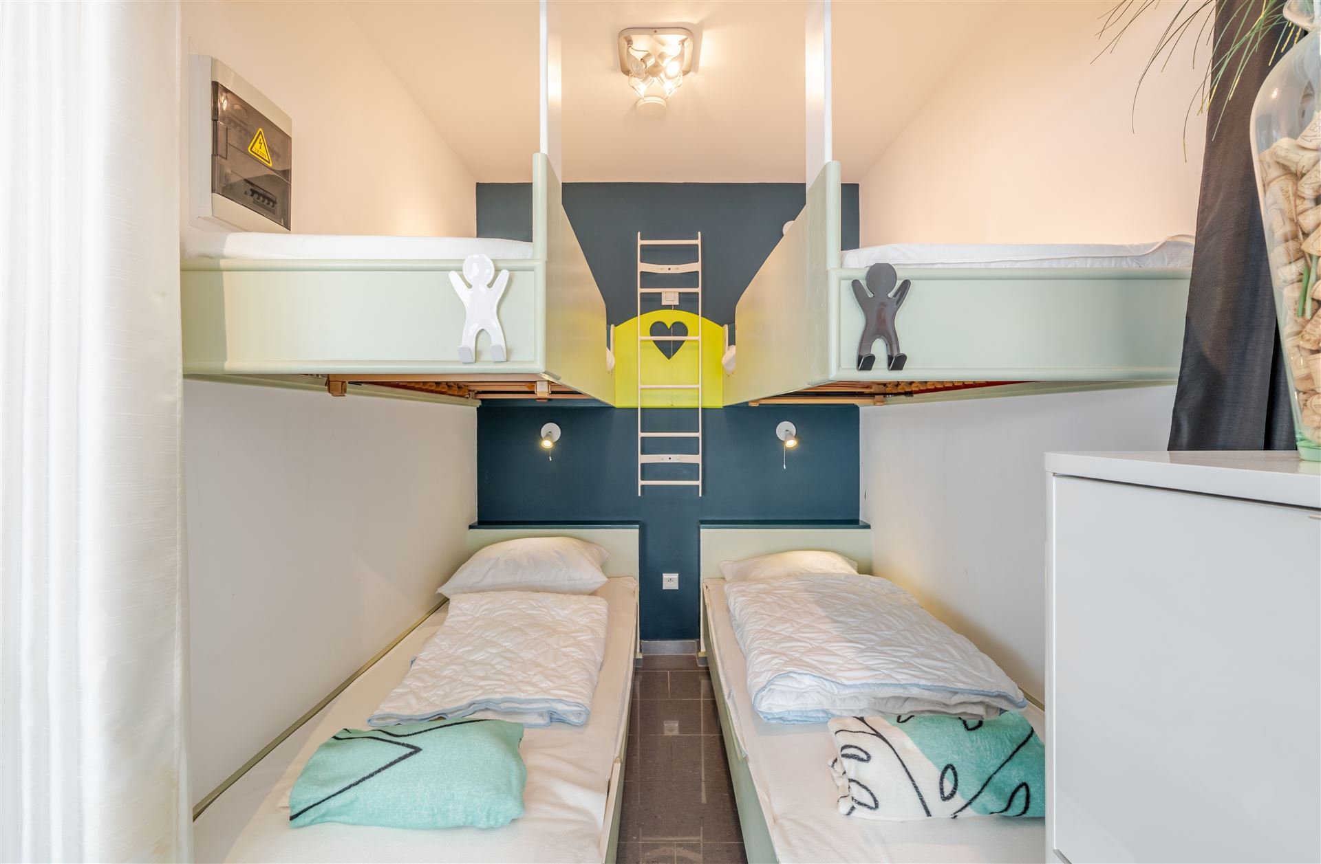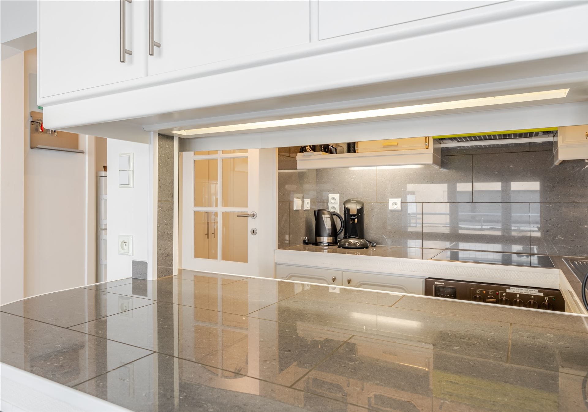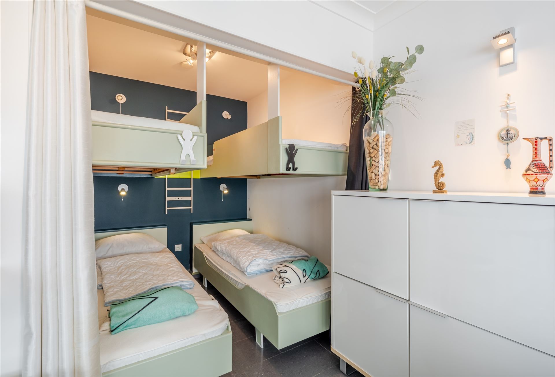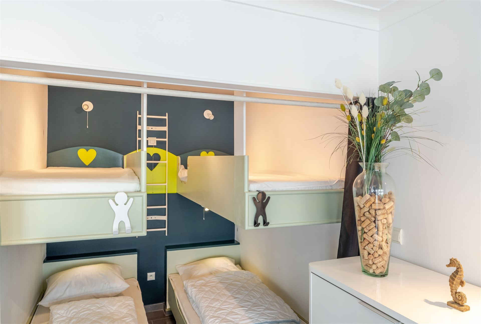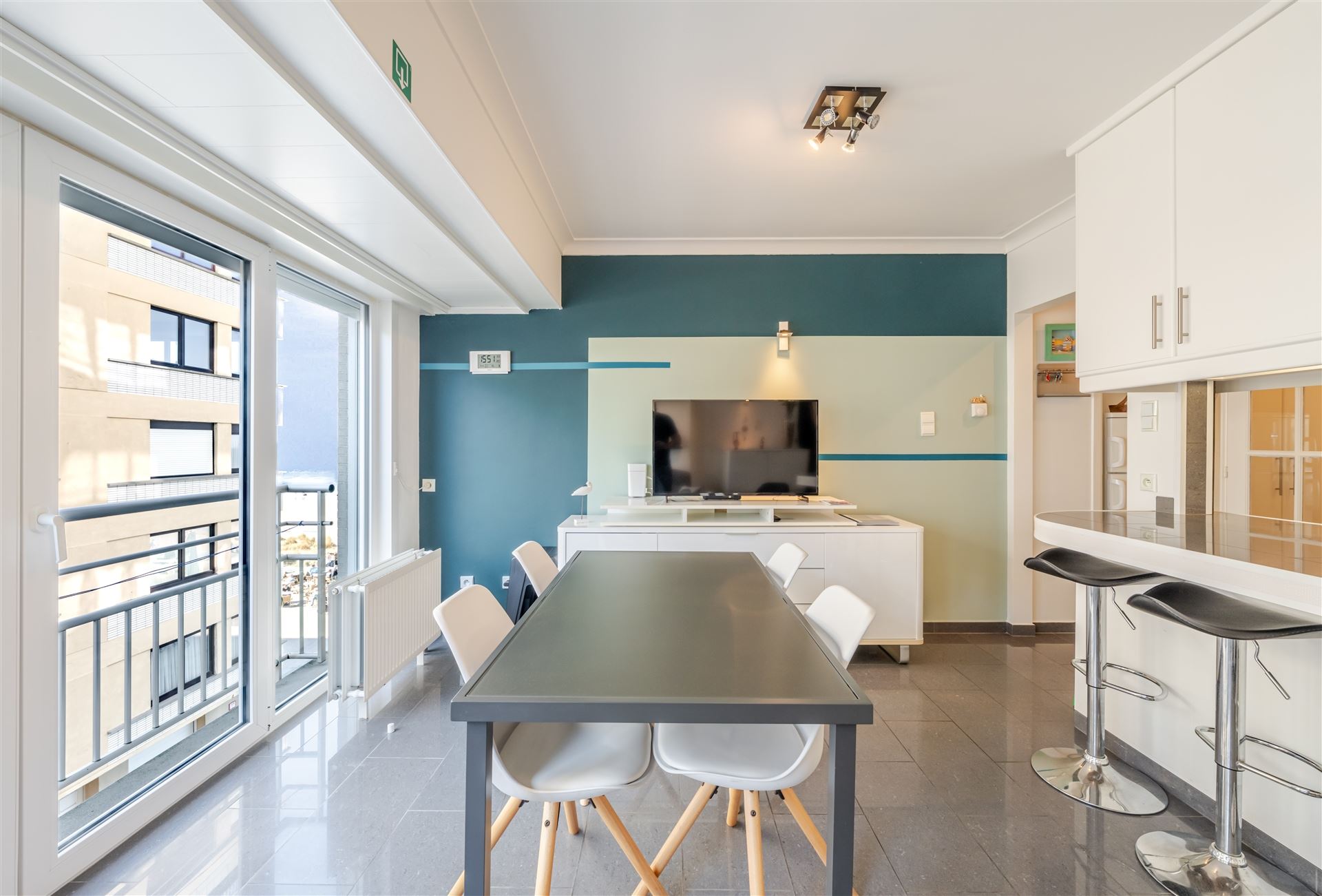 De moderne open keuken is voorzien van kwalitatieve apparatuur en werkbladen met veel opslagruimte. De slaapkamer is intelligent ingedeeld met ingebouwde kasten voor optimale ruimtebenutting. Het appartement heeft een eigentijds designconcept met frisse kleuraccentuaties en geelgroene tinten.