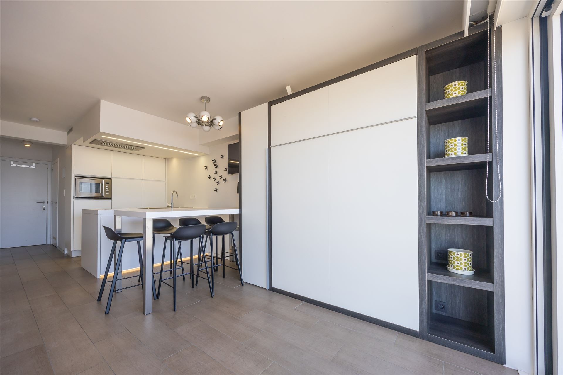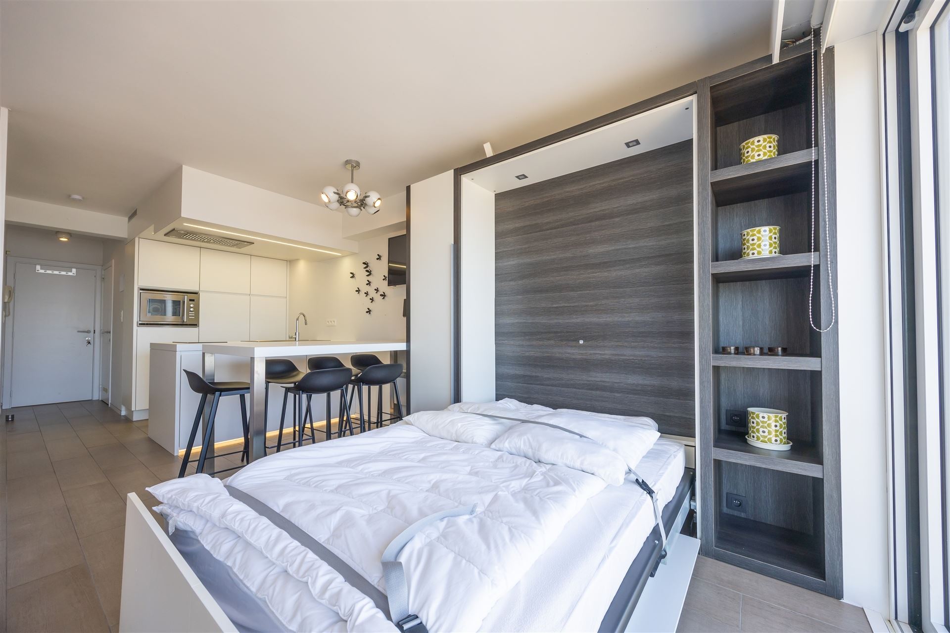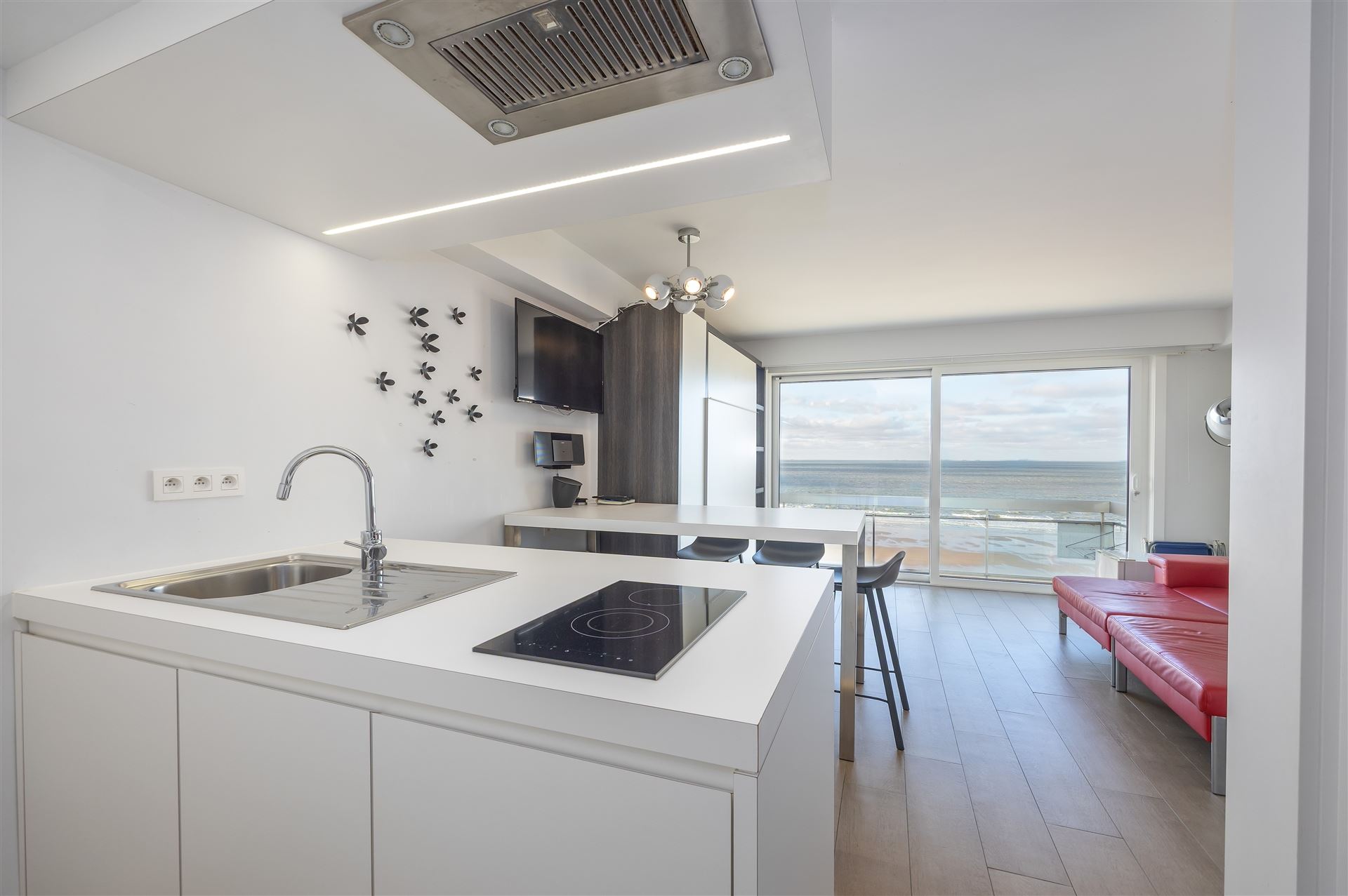 Ruime, gerenoveerde studio met frontaal zeezicht met als indeling : woonkamer voorzien van groot wandmeubel met tweepersoonsbed, ruime open keuken met eiland, aparte slaaphoek met stapelbed, badkamer met lavabomeubel, douche en toilet, terras. De studio wordt volledig gemeubeld verkocht en is overal voorzien van maatwerk. Conforme elektrische installatie. De studio werd steeds verhuurd als vakantieverblijf waardoor alles ook conform de huidige wetgeving is. Mooi pand op absolute topligging op de Zeedijk vlakbij het winkelcentrum en nieuwe Casino.