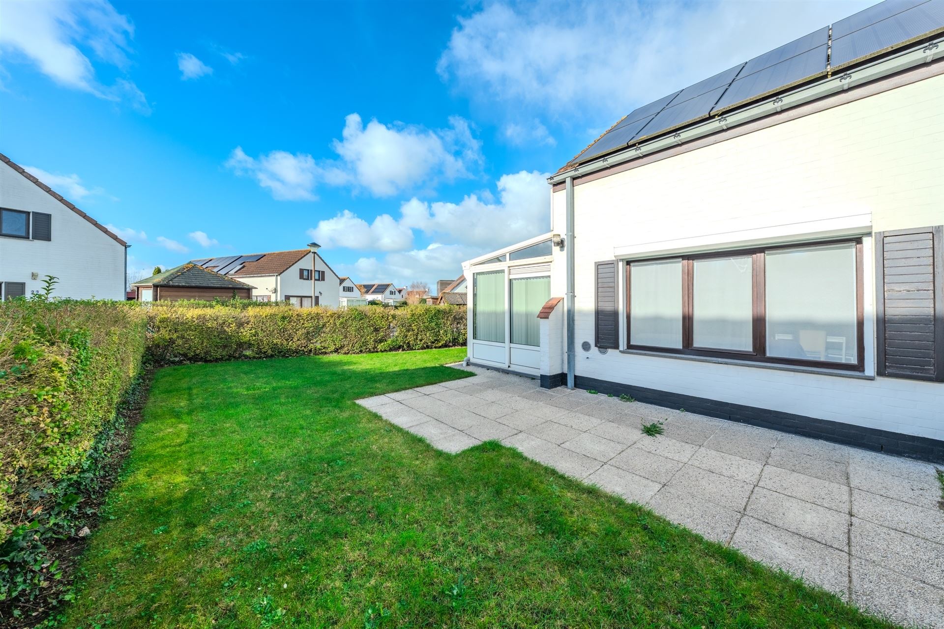 De tuin is netjes onderhouden met groene hagen die privacy bieden.