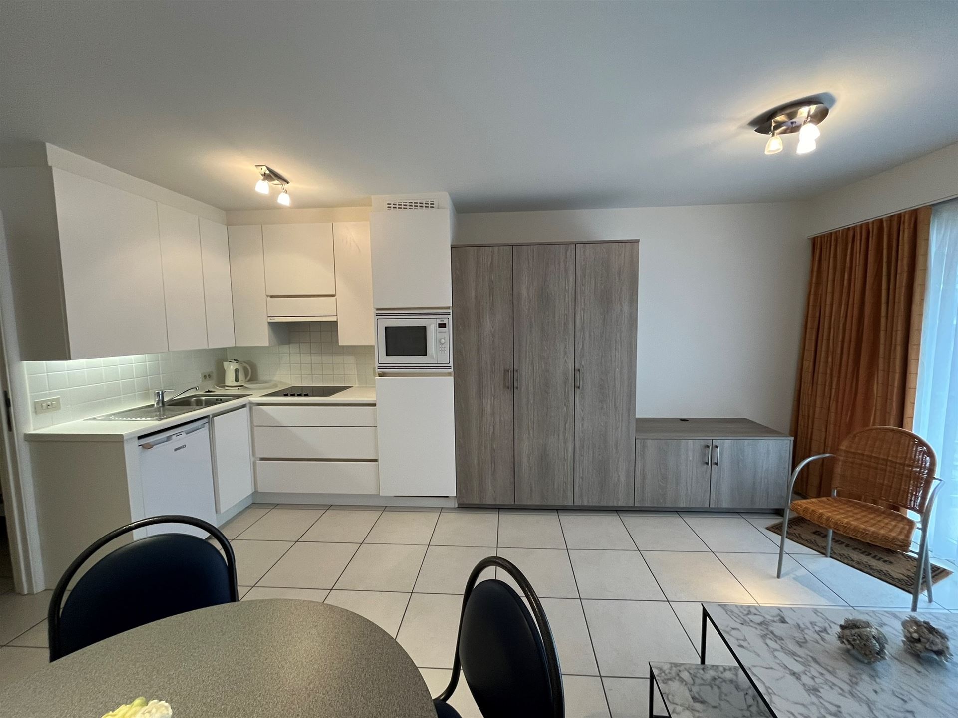 Gezellige studio gelegen in het centrum van Middelkerke. Bestaat uit inkom/slaaphoek, badkamer met ligbad, woonkamer met open keuken, terras. Voorzien voor max 3 personen. Geen huisdieren toegelaten. Niet binnen roken. Maandelijkse huurprijs €670 + €50 forfait vaste kosten. Vrij vanaf 16/07. Bezoek op afspraak.