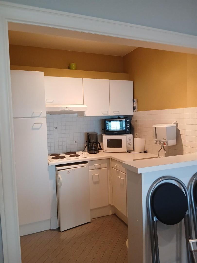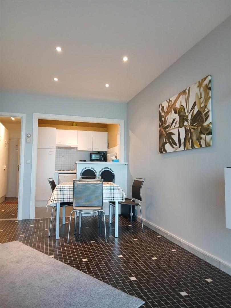 Gezellige studio met frontaal zeezicht vlakbij het winkelcentrum.Indeling : woonkamer met open keuken, badkamer met douche en toilet. Terras vooraan. Voorzien voor 4 personen. Huisdieren niet toegelaten.